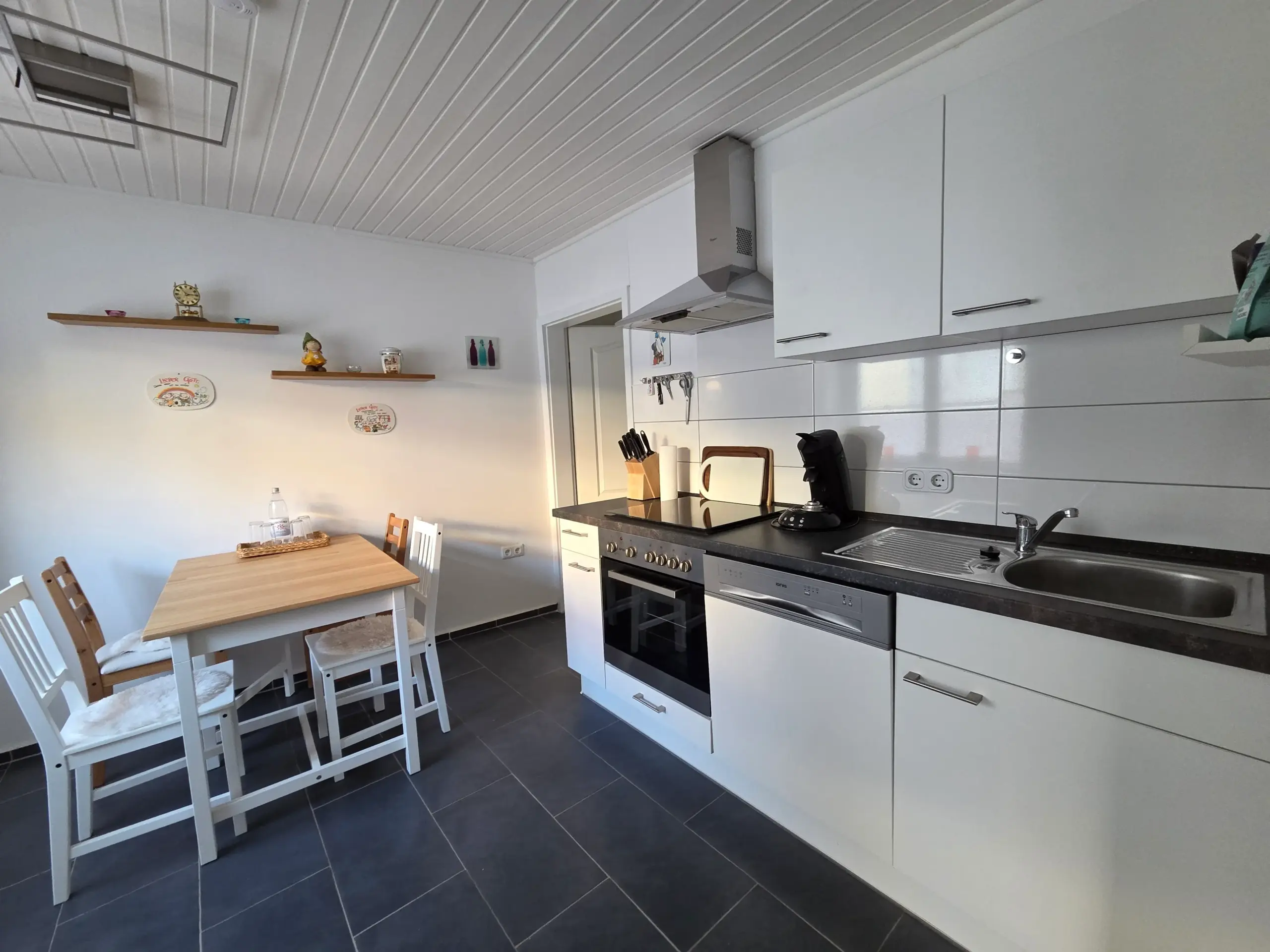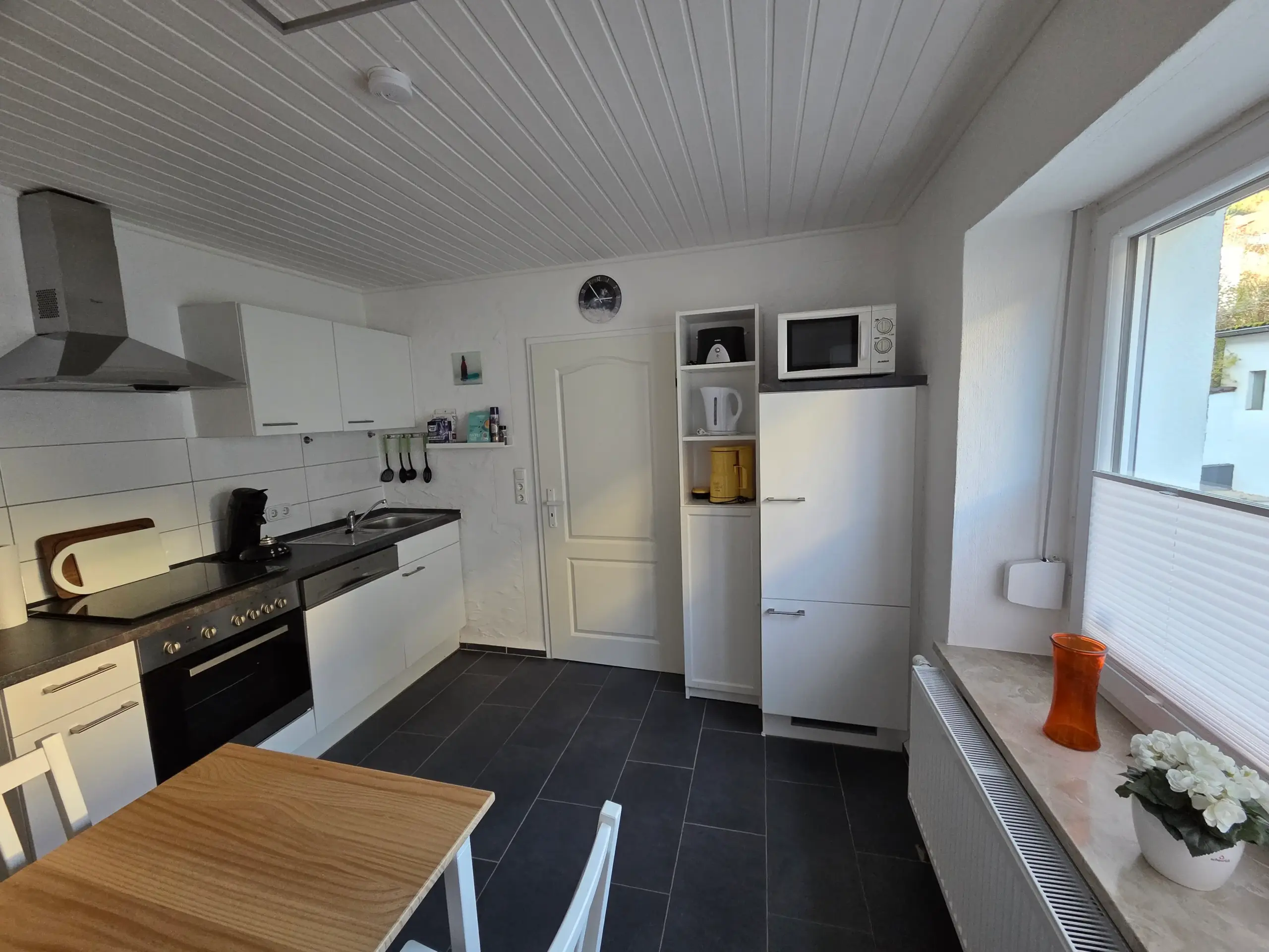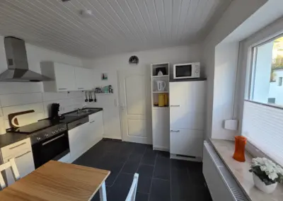 Küchen-/Haushaltsgeräte: Herd mit Ceranfeld und Backofen, Kühlschrank, Mikrowelle, Toaster, Nespresso-Kaffeemaschine, Aufbrüh-Kaffeemaschine, Wasserkocher, Eierkocher, Geschirr und Besteck, Küchenutensilien, Bügelbrett und Bügeleisen